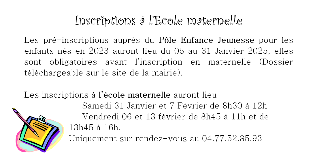 A savoir : Un courrier émanent du Pôle Enfance Jeunesse va être envoyé aux familles la première semaine de décembre avec toutes les informations liées à ces inscriptions.